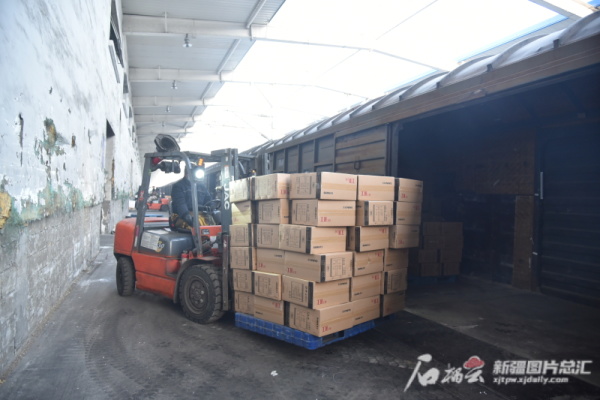 1月28日上午,在中国铁路乌鲁木齐局集团有限公司乌鲁木齐货运中心三坪货场内,一辆辆叉车穿梭在车厢和货位间,将托盘上的货物一件件码放在货位上,一辆辆货车陆续开进货场,将刚卸下的货物装车,运往乌鲁木齐市各批发零售点。
