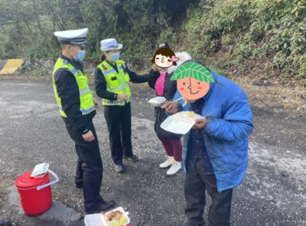 了解情况后,民警立即联系大队食堂准备饭菜、面包和矿泉水,之后又将食物送到夫妻二人面前。
