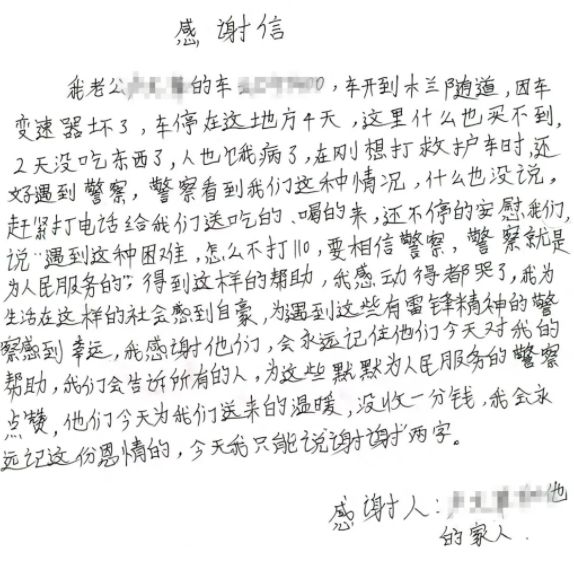 看到热气腾腾的饭菜,高某感动得热泪盈眶,表示会永远记住民警的“救命之恩”,并当场写下了感谢信,向帮助自己的保山交警表示感谢。