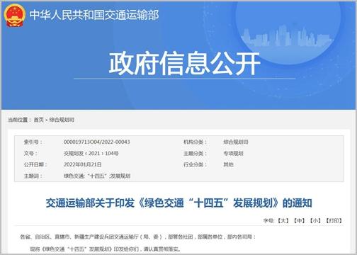 据交通运输部官网消息,为落实《中华人民共和国国民经济和社会发展第十四个五年规划和2035年远景目标纲要》要求,按照《交通强国建设纲要》《国家综合立体交通网规划纲要》相关战略部署,交通运输部印发《绿色交通“十四五”发展规划》(以下简称《规划》)。