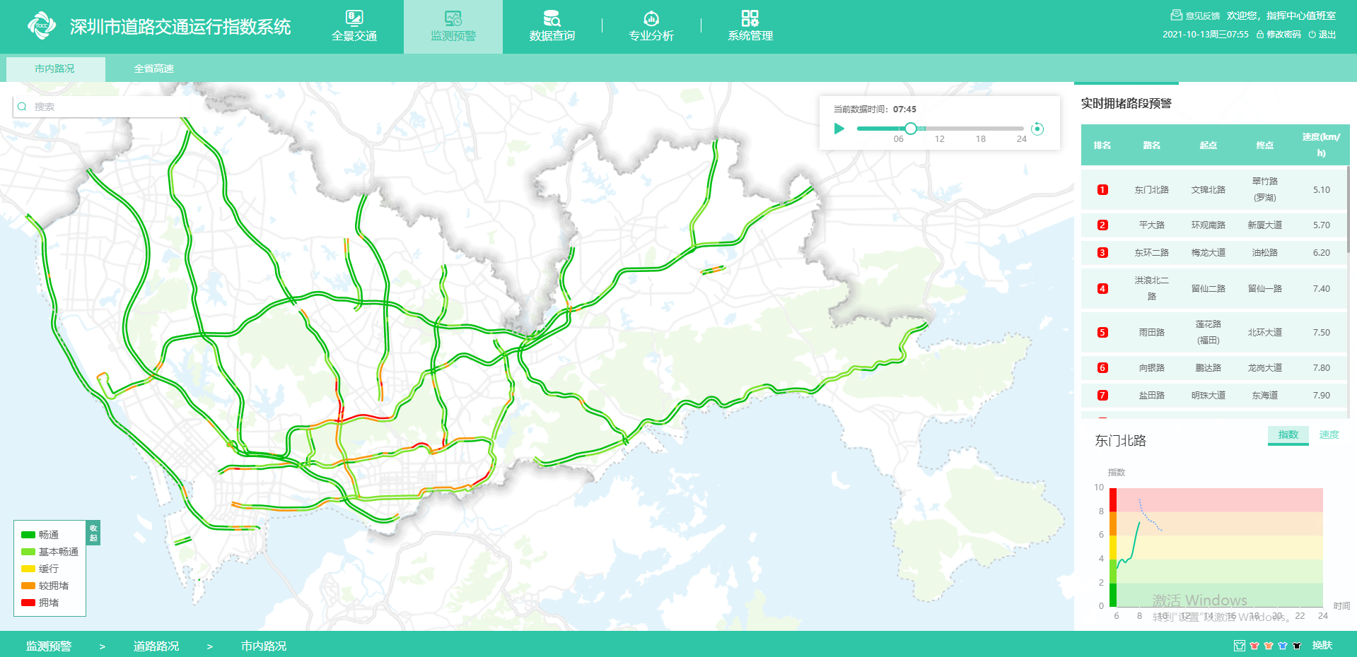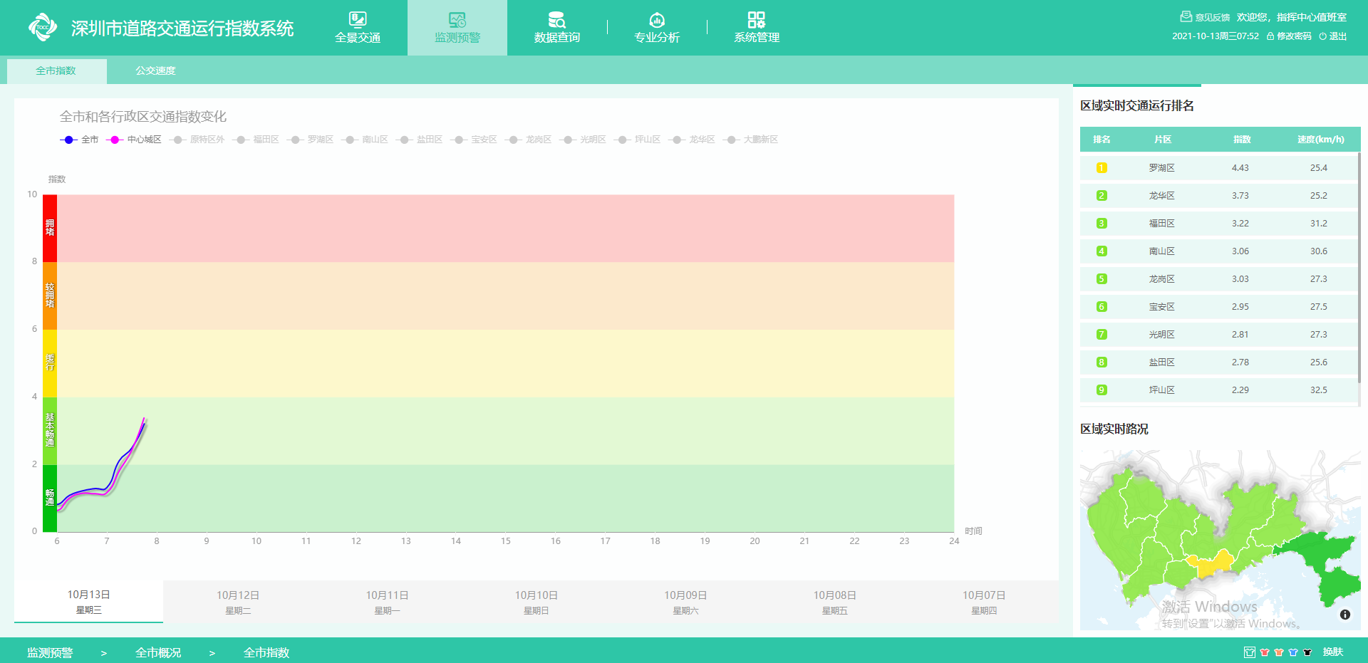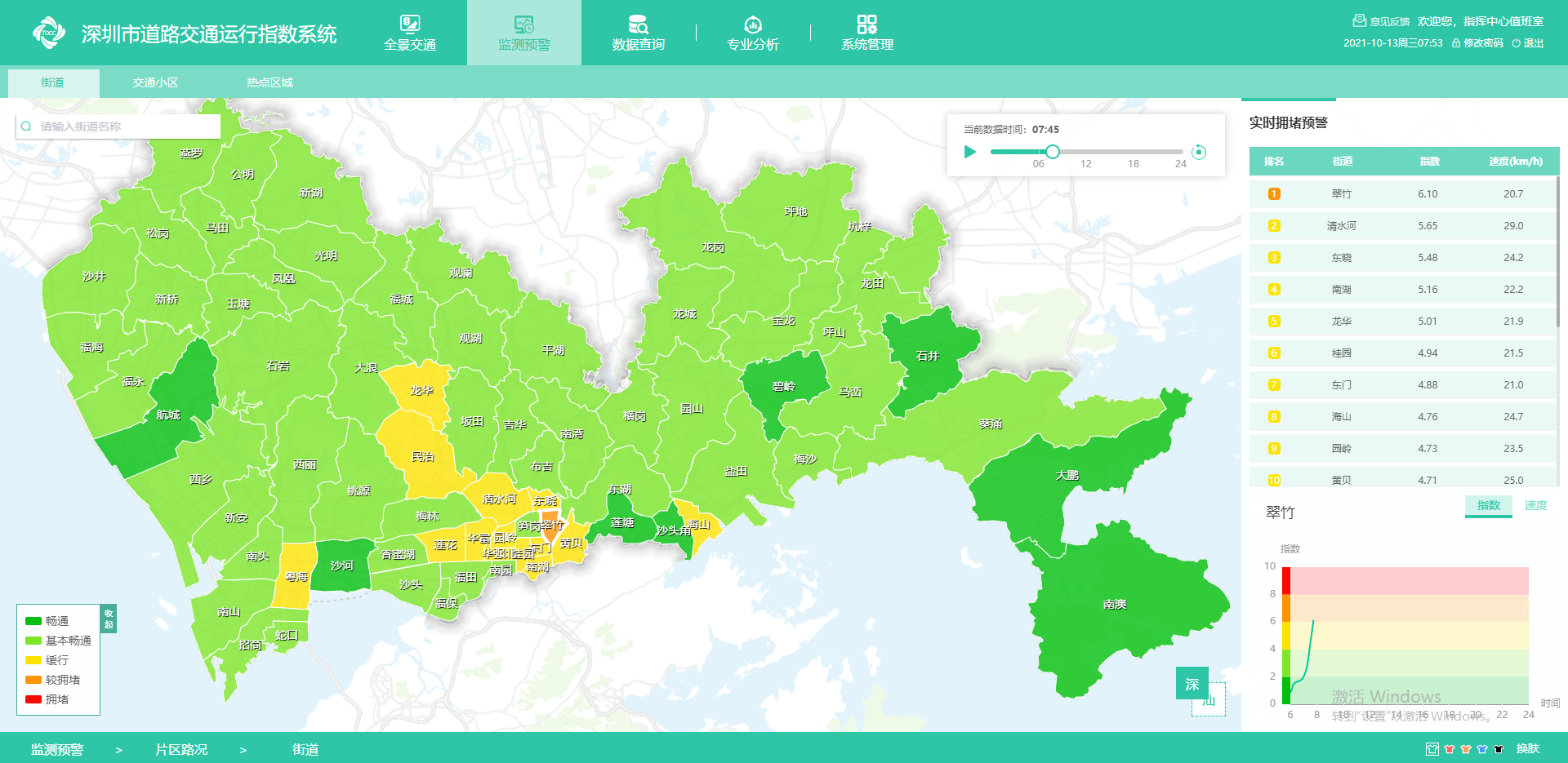 10月13日全市交通指数变化及区域实时交通运行排名图当前市内拥堵排名前五的街道为:翠竹、清水河、东晓、南湖、龙华,分别处于较拥堵、缓行、缓行、缓行、缓行等级