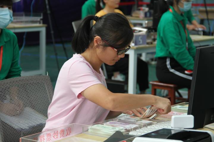 “您好,请您出示通行卡!“甜美的微笑伴随嘹亮的声音,是选手们职业素养的展示。考场里,亲切诚恳的声音此起彼伏。这是第一项的入口发卡环节,也是一项”微笑考核“,是收费员必须拥有的“神技”。然而到了第二个环节,各位参赛选手马上又切换到了紧张的收费模式。他们的手指将键盘敲得啪啪响,聚精会神地盯着电脑屏幕,确认通行的一辆辆车。随后的第三个环节,各位参赛选手又化身为点钞机,指尖轻巧跳动,一沓沓练功券不一会儿就计数完毕了。