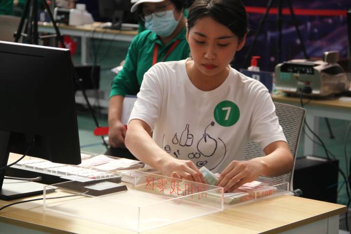 公路收费及监控员职业技能竞赛现场进行的是模拟实战。参赛员完全模拟实际,入口发卡、出口收费及收费清点。单场比赛中,七名参赛选手齐聚一堂,每名选手都要在两位监考员的注视下,完成高速收费员的职责。